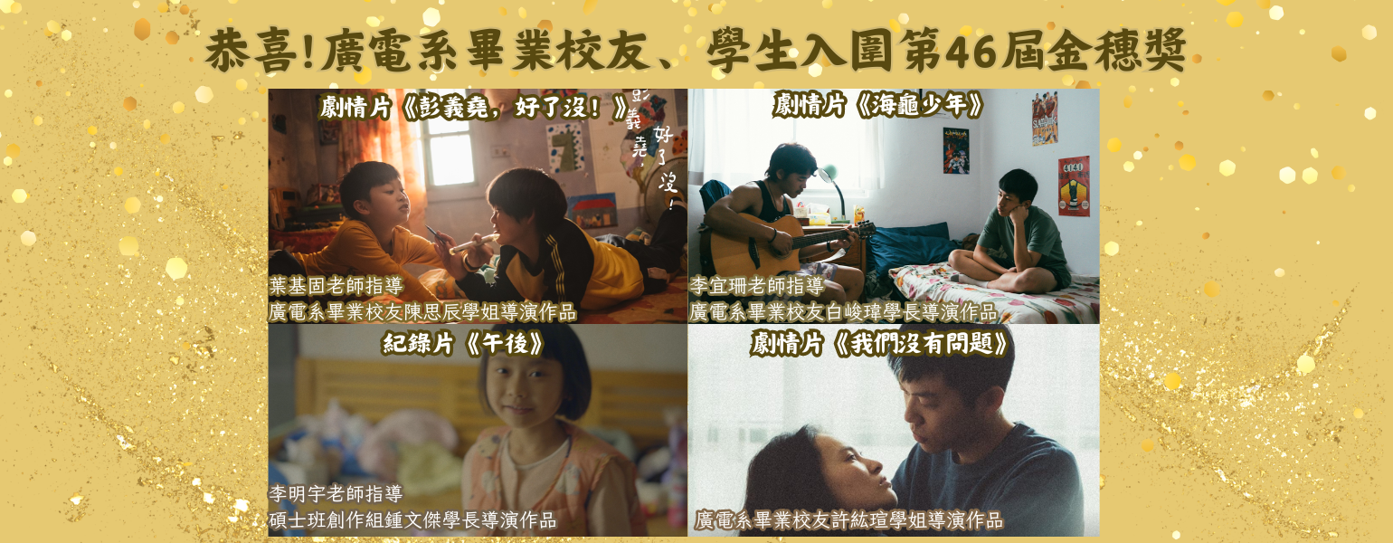 葉基固老師指導廣電系畢業校友陳思辰學姊參加第46屆金穗獎,以作品《彭義堯,好了沒!》獲得劇情片入圍 (1) Full size 1540 × 600 pixels Previous image Next image